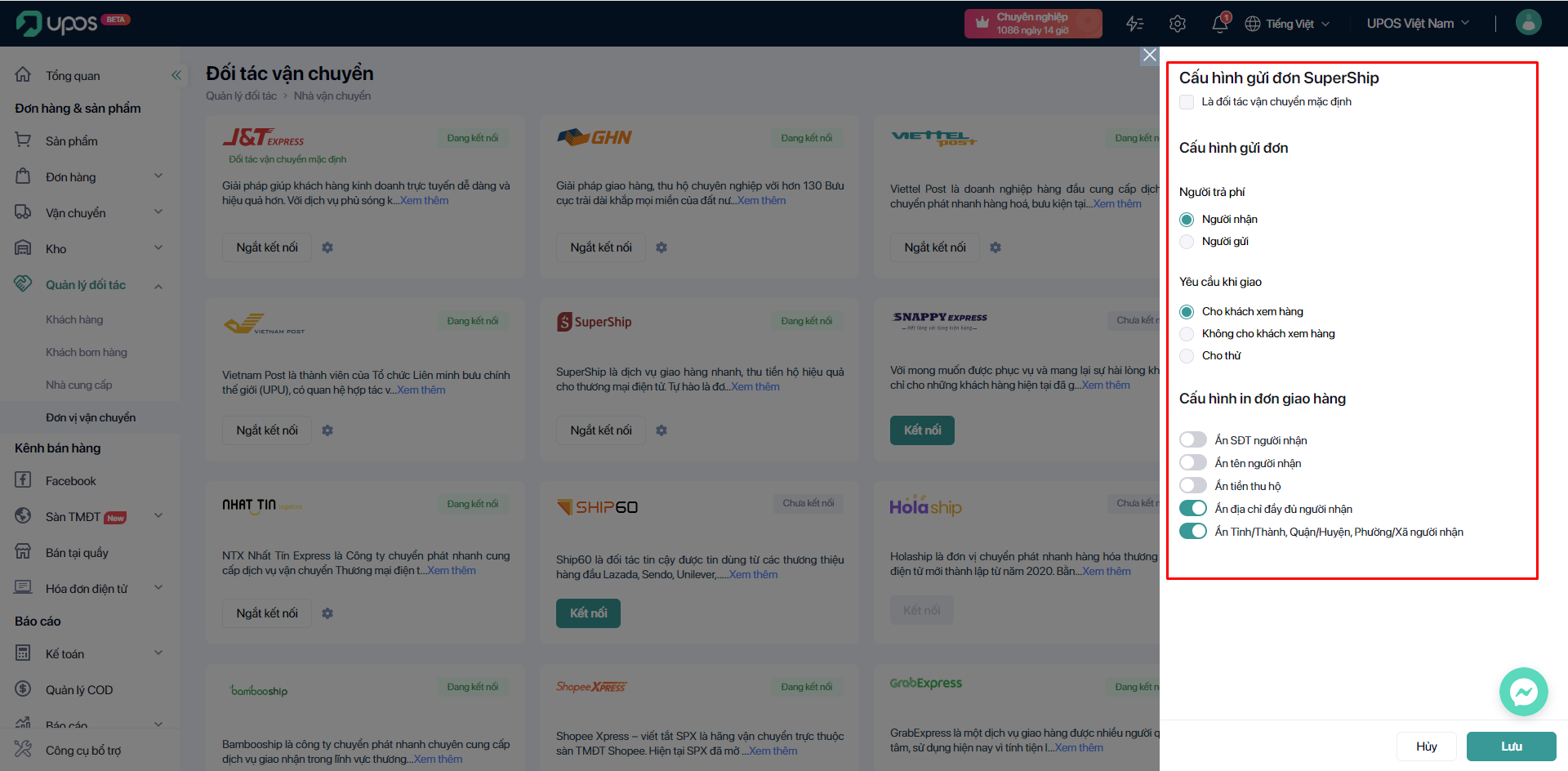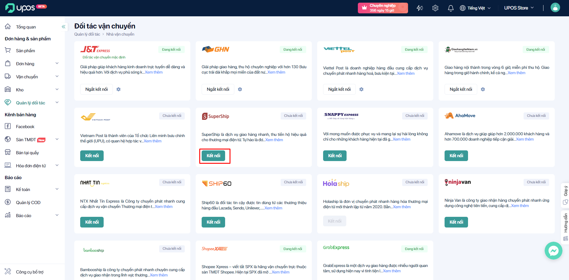 **Bước 1:** Nhấn nút **Kết nối** (menu **Thông tin chung** >> chọn **Quản lý Đối tác** >> chọn **Đơn vị vận chuyển**) ở vị trí đối tác **SuperShip**.