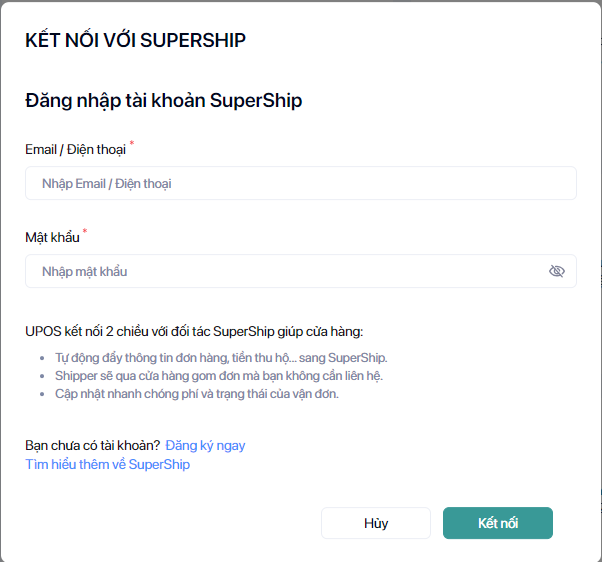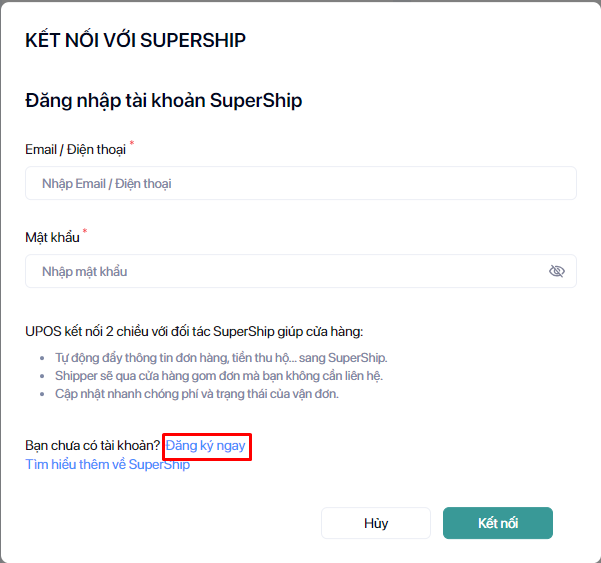 Nếu chưa có tài khoản SuperShip thì có thể chọn vào Đăng ký ngay bên dưới