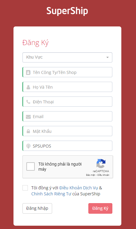 Sau khi nhấn vào link Đăng ký ngay thì sẽ chuyển sang trang Đăng ký của hệ thống SuperShip. Điền đầy đủ thông tin bên dưới để có tài khoản.