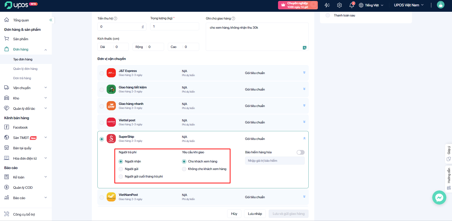 Ví dụ: Đang chọn mặc định người trả phí là **Người nhận** rồi vào trang **Tạo đơn hàng** sẽ thấy chọn Người nhận và yêu cầu khi giao là **cho khách xem hàng** như hình dưới.